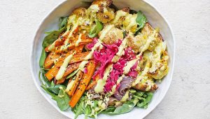 - To serve, divide the rocket between 2 bowls. Add the roasted vegetables, fermented vegetables,s and protein of choice. Drizzle dressing over bowls and top with sesame seeds.