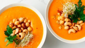 - To serve, divide the soup between bowls and top with chickpeas, toasted cashews, fresh herbs, alfalfa sprouts, and chili flakes if using.