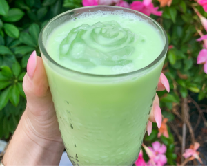 Traditionally, matcha is whisked in a bowl (this is technically the correct way to prepare it). I hadn’t yet invested in the supplies (just dipping my toe in the shamrock green waters over here), so I put everything but the ice in my Vitamix and whirled it all together on the lowest setting to avoid making a lot of foam. I poured it over a jumbo ice cube, et voilà: iced matcha latte. You can substitute any liquid you’d like for this recipe, keeping the 1 tsp matcha to 12 ounces of fluid ratio. I personally found that coconut and rice milk blended really nicely with my matcha powder in terms of viscosity and flavor profile.